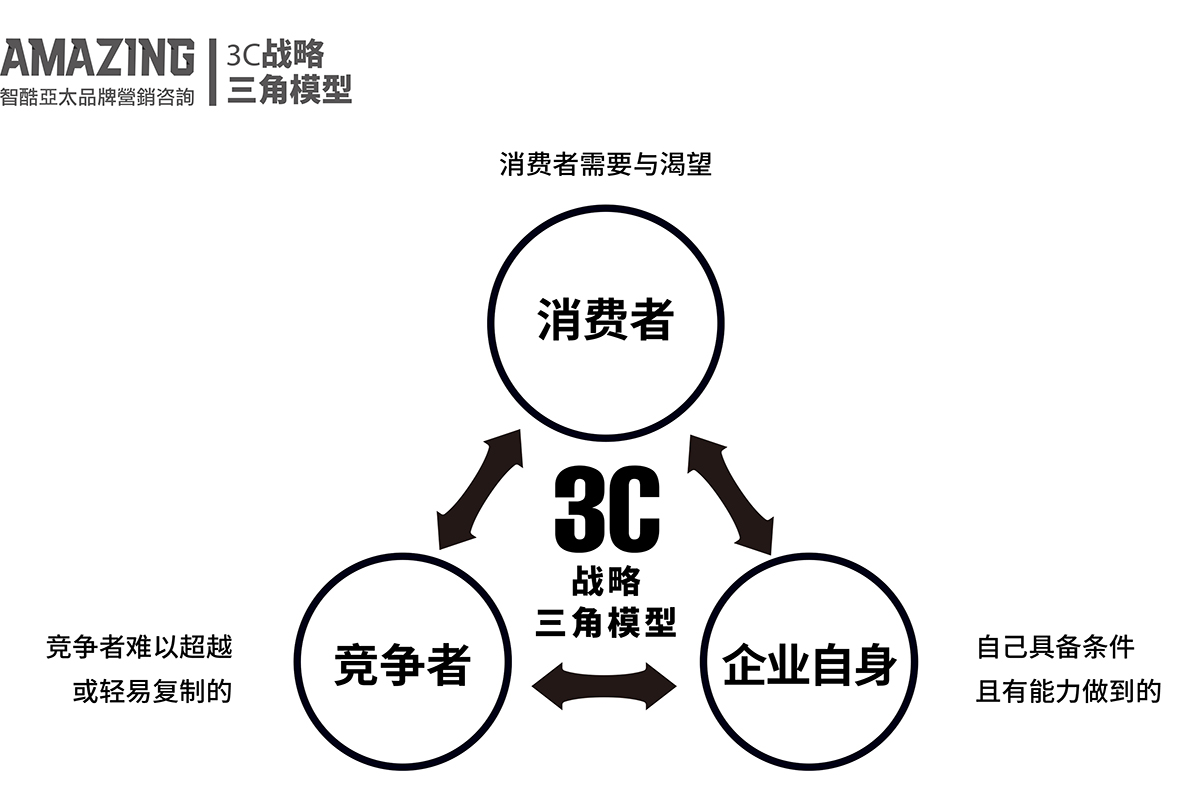 搭建超级品牌生意系统的第一步是战略分析,即智酷亚太常用的3C战略模型。通过洞察消费者需求、挖掘企业自身优势、审视竞争者可复制性三个维度,挖掘品牌核心价值,形成品牌差异化竞争战略优势。