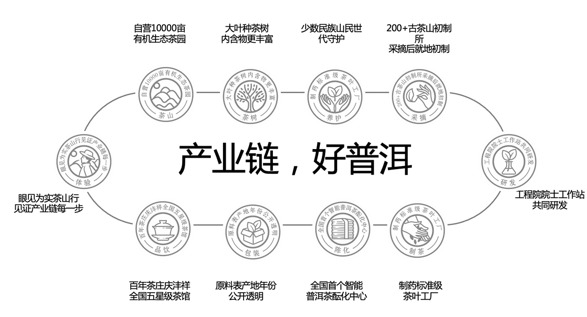 “普洱茶全产业链”是指由茶山到茶杯所涵盖的茶山勘选、茶树探寻、种植养护、采收采购、研发、制茶、陈化仓储、包装运输、品饮体验、文化传播、品牌推广等多个环节构成的完整的产业链系统。通过对茶叶质量进行全程控制,实现茶叶品质可追溯,解决普洱茶行业无标准、不透明的问题。