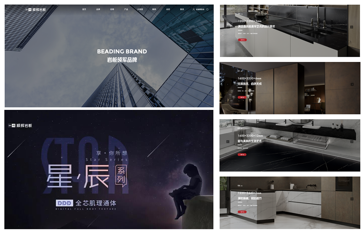 03 顺辉岩板缺乏有代表性的视觉形象和记得住的品牌符号,不利于消费者快速记住品牌并播传品牌,产品视觉以应用场景为主,没有形成差异化的品牌形象系统
