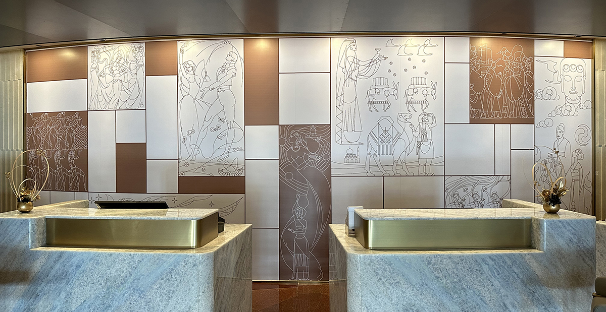 为了以更时尚、更现代的方式升级视觉资产,展示21世纪海上丝绸之路排头兵的新形象,呈现更开放的中国和更繁荣的世界。我们对中国大酒店鎏金壁画进行重绘和重构,让大师经典作品现代化、年轻化、互动化、品质化,为消费者呈现史诗般的视觉盛宴。