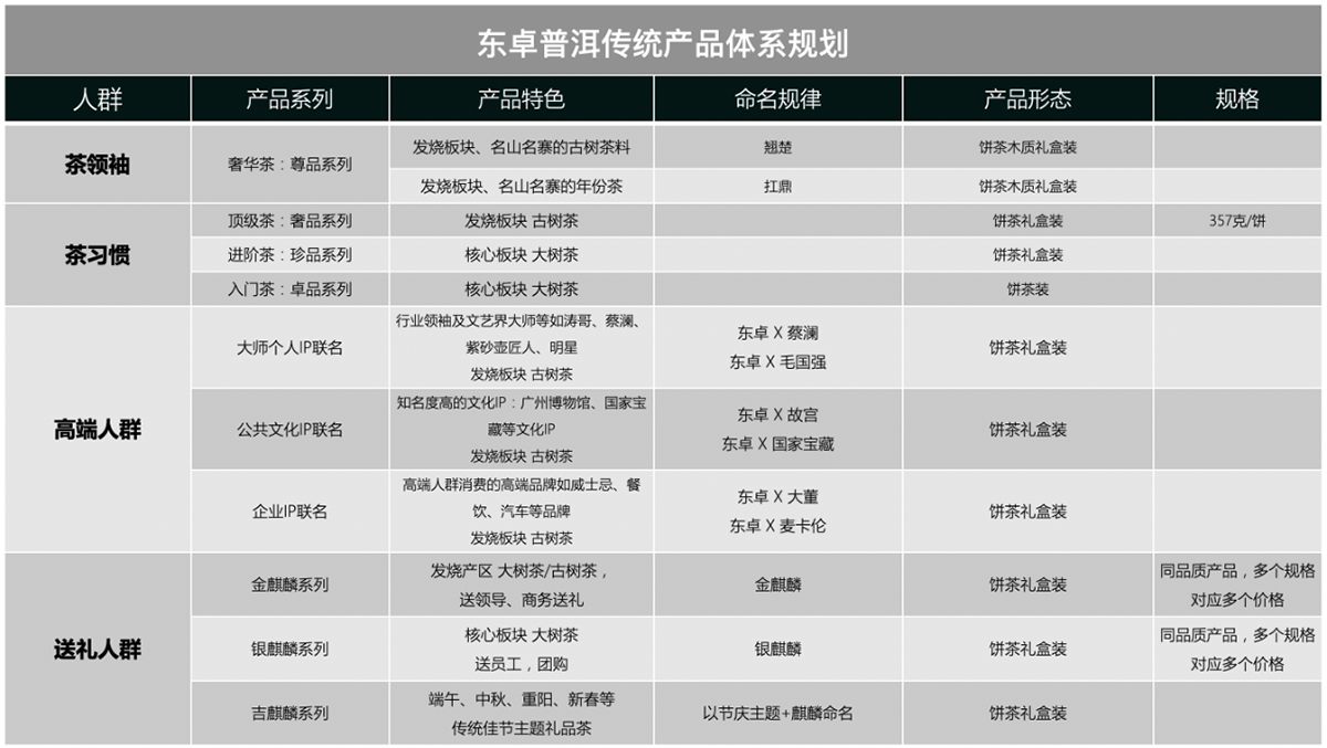 同时针对高端人群和送礼人群规划联名产品系列和专属麒麟礼品系列,并系统规划产品原料产区、产品形态、规格和价格等,与传统产品系列共同组成东卓全新的人货场产品矩阵。