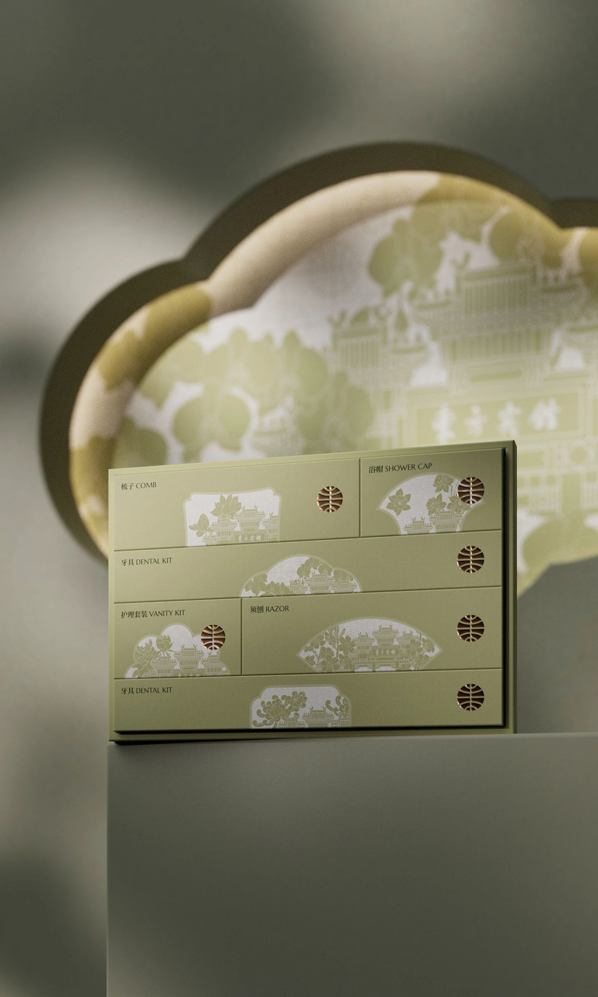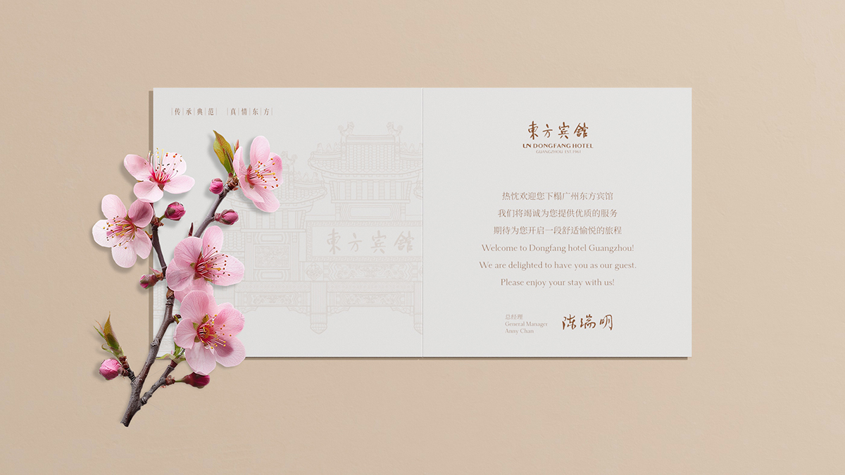 我们将十二花令作为岭南园林文化IP的主创意元素,同时以岭南园林门洞为框架创作十二园林花令图,形成专属于东方宾馆的文化视觉IP,最后将其应用于新升级的东方宾馆客房:客房以十二花令为主题进行全新装修、在每个月的客房问候卡上附上一朵当月花令的小花,为消费者提供全新的独属于东方宾馆的消费体验。