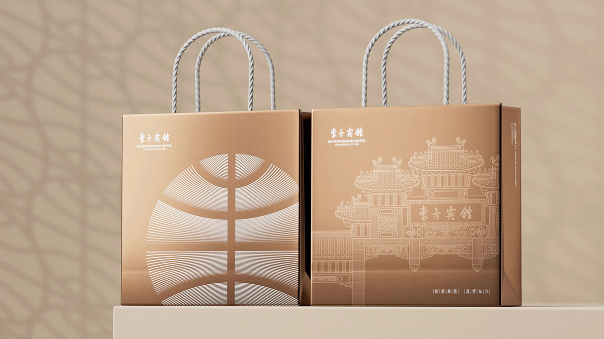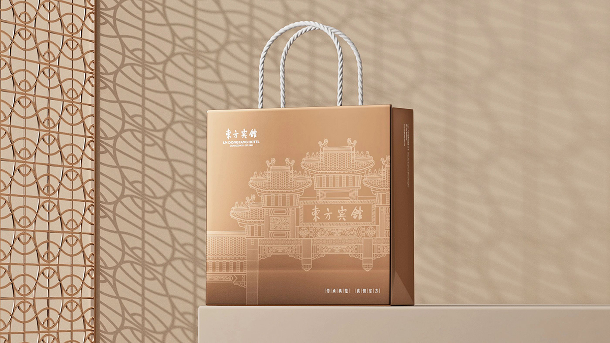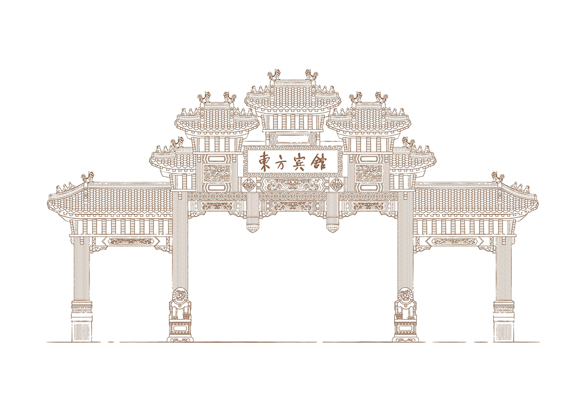 东方宾馆牌坊是消费者心智中已有的视觉资产,我们通过线绘全新的东方宾馆牌坊,并严格规范牌坊的使用标准,通过标准化、多元化的场景应用,让人一看到品牌牌坊,就能认出这是东方宾馆。