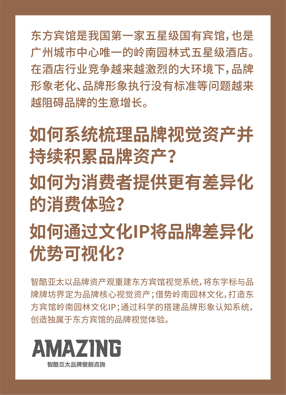 伴随酒店行业竞争陷入白热化,东方宾馆品牌形象老化、品牌形象执行没有标准等问题越来越阻碍品牌成长。如何让东方宾馆在激烈的行业竞争中继续占据优势、如何将东方宾馆的竞争优势转化为消费者可感知的视觉系统成为品牌面临的严峻挑战,作为岭南控股战略合作伙伴,智酷亚太全面负责东方宾馆品牌形象系统升级。